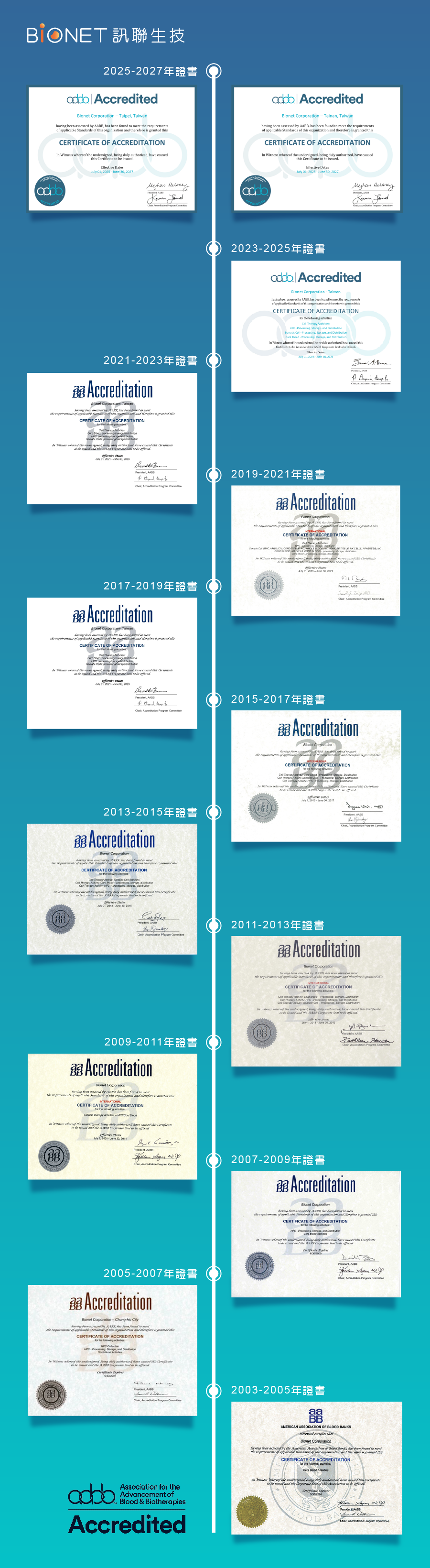 2003~2027年連續12次皆通過兩年一審的嚴審紀錄。2011年10月,訊聯再次領先業界,成為全球首家AABB跨國認證之臍帶間質幹細胞(MSC)儲存暨處理技術中心,再次肯定訊聯追求卓越品質的堅持,與世界級的儲存技術。取得AABB國際認證,代表訊聯所儲存的細胞品質可與國外醫療單位進行移植合作,是給客戶最好的品質明證。