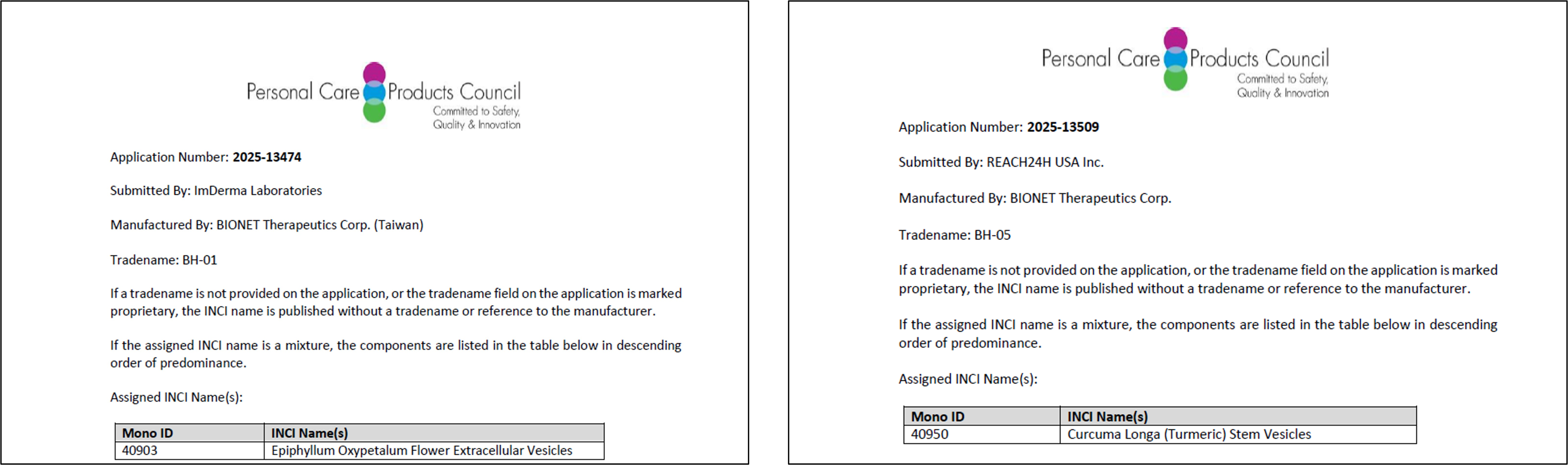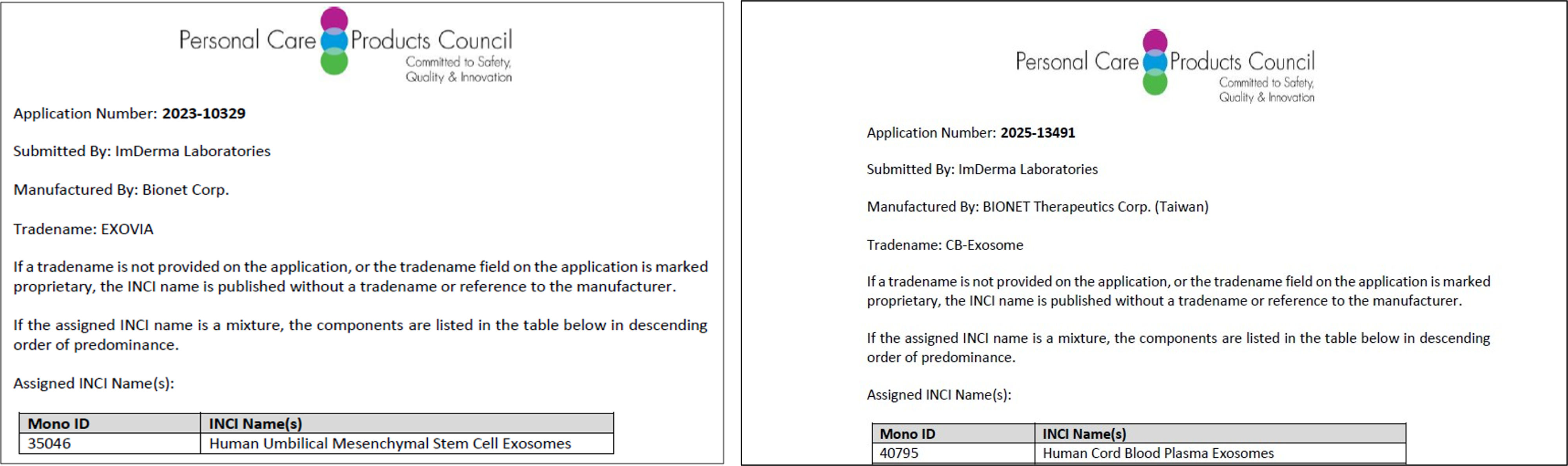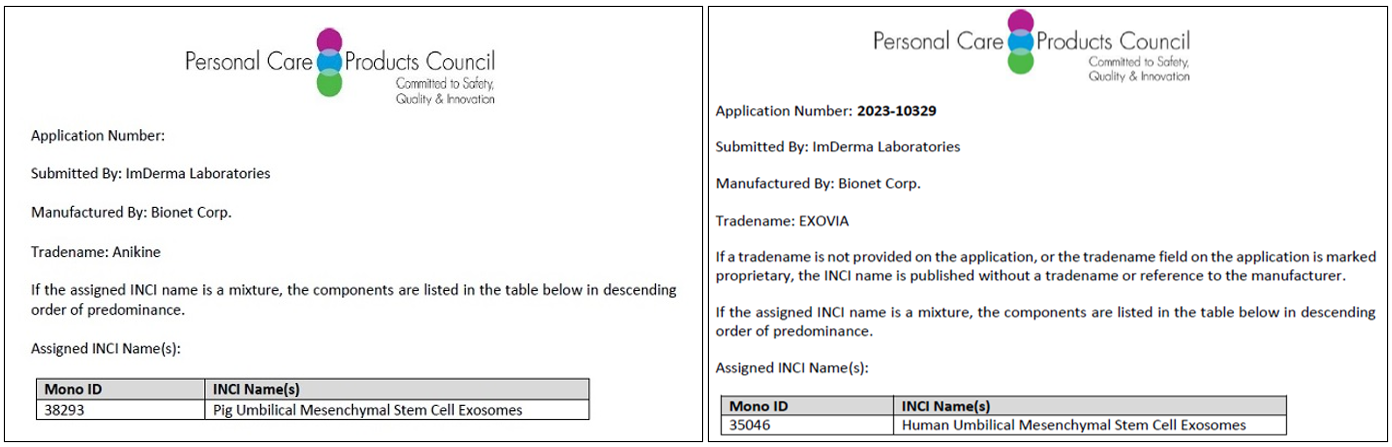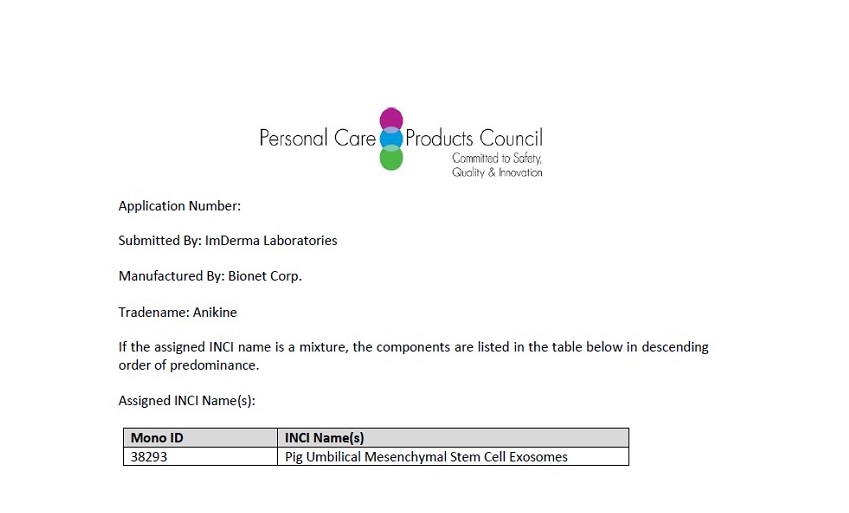 獲美國個人護理產品委員會(PCPC)核可認證INCI name 國際化粧保養品成分名稱,為全台第一家取得間質幹細胞分泌之外泌體(Exosome)認證。