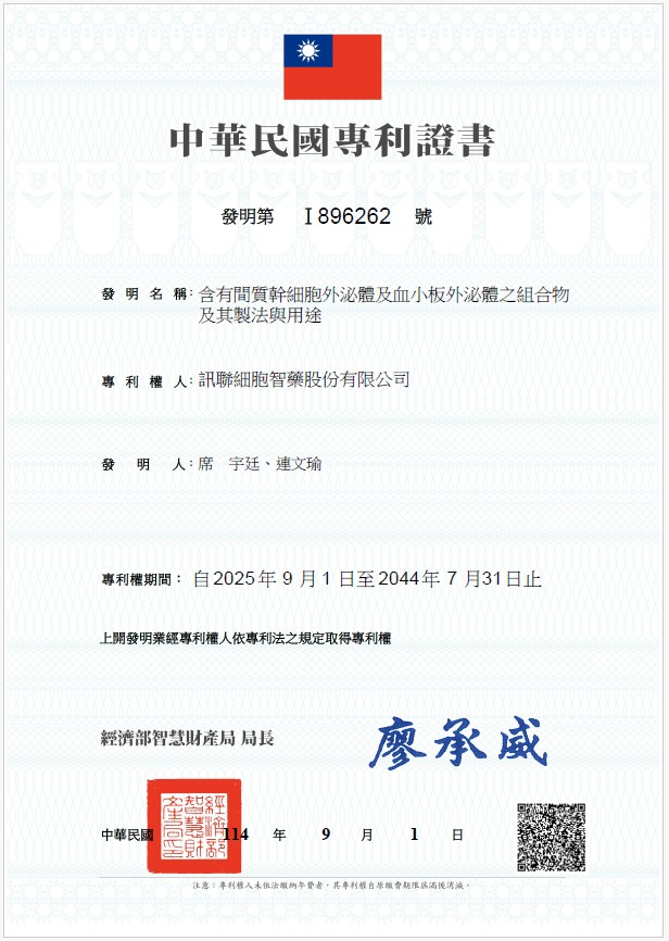 ◆ 第I896262號專利證書:含有間質幹細胞外泌體及血小板外泌體之組合物及其製法與用途