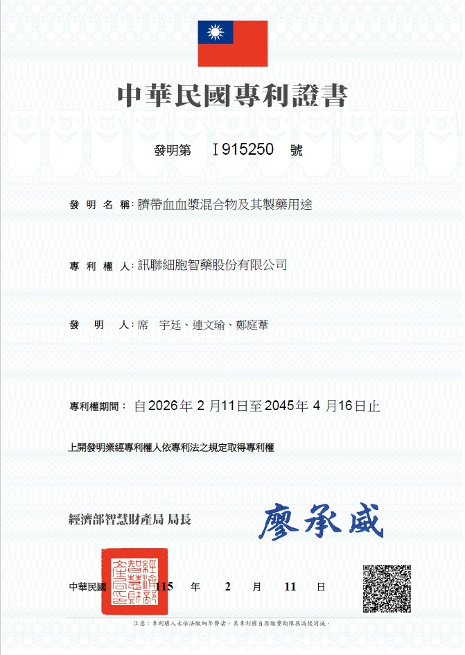 ◆ 第I915250號專利證書:臍帶血血漿混合物及其製藥用途
