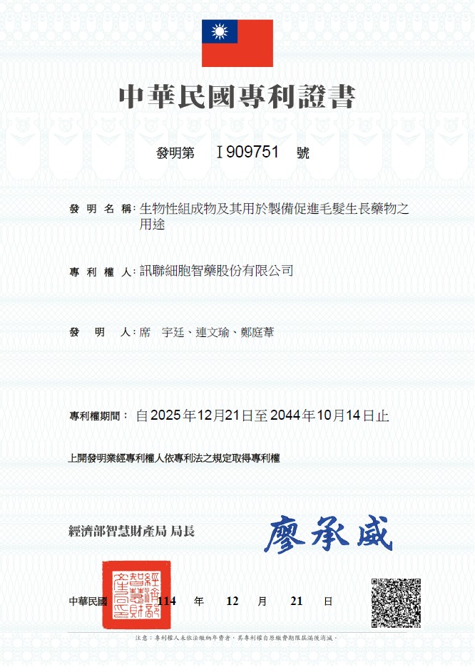 ◆ 第I909751號專利證書:生物性組成物及其用於製備促進毛髮生長藥物之用途