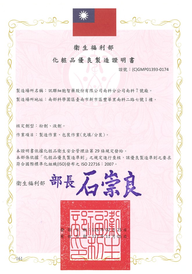 此外,保養品製造廠取得國際雙認證:GMP標準優良製造場域 及 符合歐盟化妝品GMP製造規範的「ISO 22716」。