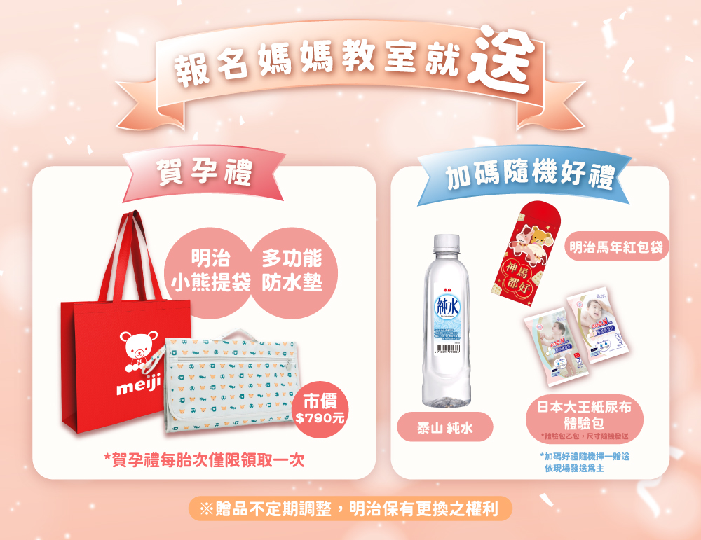 主題1:孕哺期營養全掌握 主題2:孕媽咪回復美麗的秘密~幹細胞外泌體 講師1:專業講師 講師2:訊聯專業講師 提醒孕媽咪,在訊聯官網報名完成後請務必於活動前先至「明治媽媽教室」官方網站完成會員註冊,並報名參加該場次活動,當日完成報到後,方可領取賀孕禮。