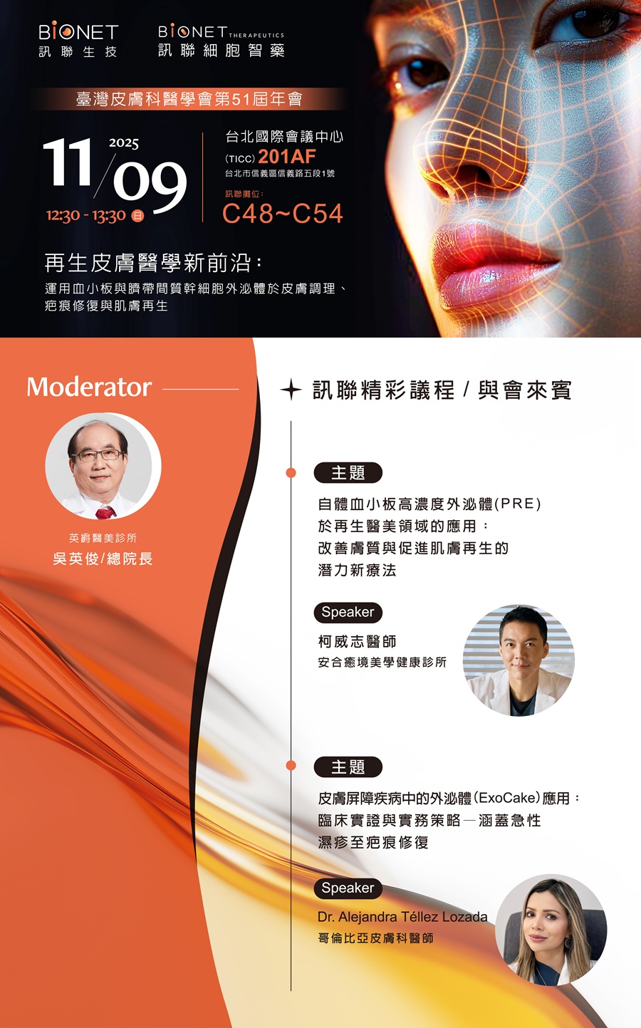 • 主題一:自體血小板高濃度外泌體(PRE)於再生醫美領域的應用:改善膚質與促進肌膚再生的潛力新療法