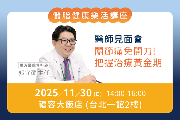主題1:醫師見面會-關節痛免開刀!把握治療黃金期 主題2:脂肪中的健康密碼 講師1:萬芳醫院骨科-郭宜潔主任 講師2:訊聯專業講師 ⚠️原訂11/1(六)講座因故延至11/30(日)舉行,造成不便 敬請見諒⚠️