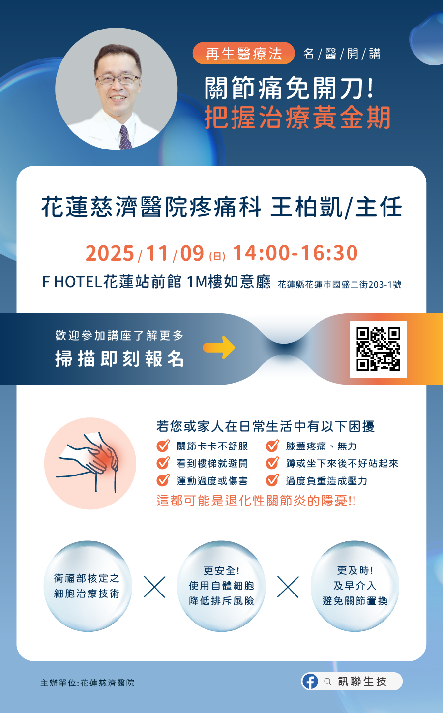 主題1:醫師見面會-關節痛免開刀!把握治療黃金期 主題2:脂肪中的健康密碼 講師1:花蓮慈濟醫院疼痛科-王柏凱主任 講師2:訊聯專業講師 溫馨提醒: