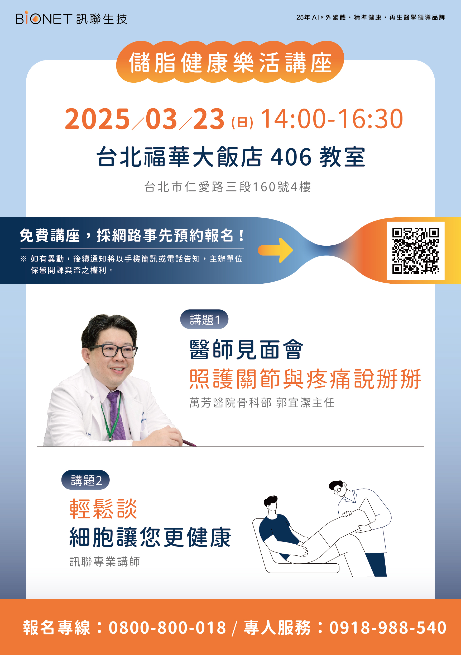 主題1:醫師見面會-照護關節與疼痛說掰掰 主題2:輕鬆談細胞讓您更健康 講師1:萬芳醫院骨科郭宜潔主任 講師2:訊聯專業講師 主題1:醫師見面會-照護關節與疼痛說掰掰主題2:輕鬆談細胞讓您更健康![]() 溫馨提醒: 1.飯店免費停車(車位有限.建議提早候位) 2.課程時間(14:00-16:30) 3.活動贈品以現場實際提供為主 4.訊聯保留隨時修改、變更、暫停或終止本活動內容之權利 【此報名處為 3/23(日) 14:00-16:30 台北福華飯店 場次】 萬芳醫院骨科-郭宜潔主任 2場特管講座 歡迎選擇您方便的時間與地點蒞臨現場,瞭解醫療趨勢! ● 3/23(日)14:00-16:30 額滿-台北福華飯店(台北市仁愛路三段160號) ● 3/30(日)14:00-16:30-萬芳醫院5樓500會議室(台北市文山區興隆路三段111號):https://www.bionetcorp.com/stemcell?crmc_id=43 |