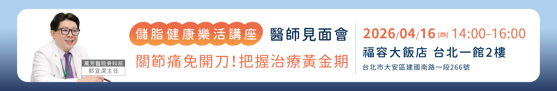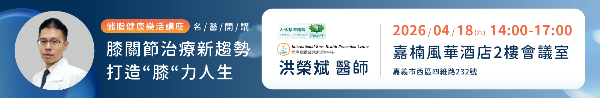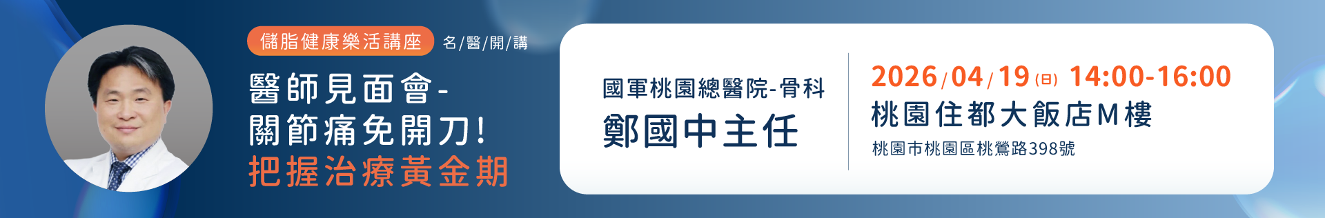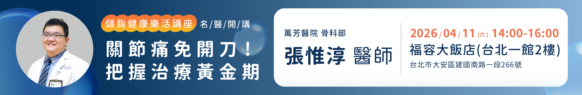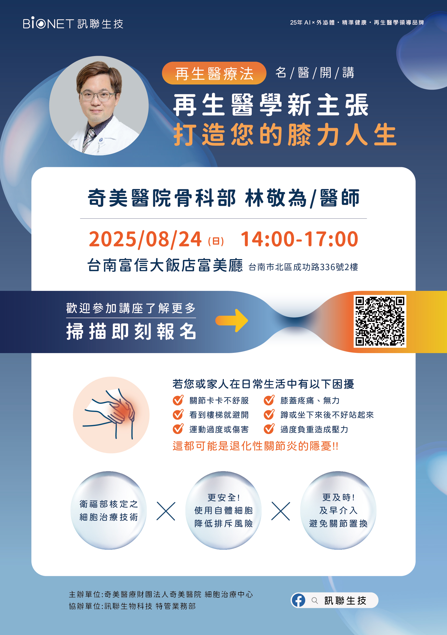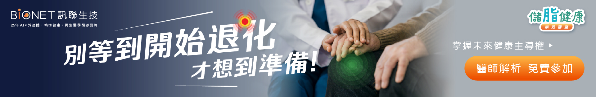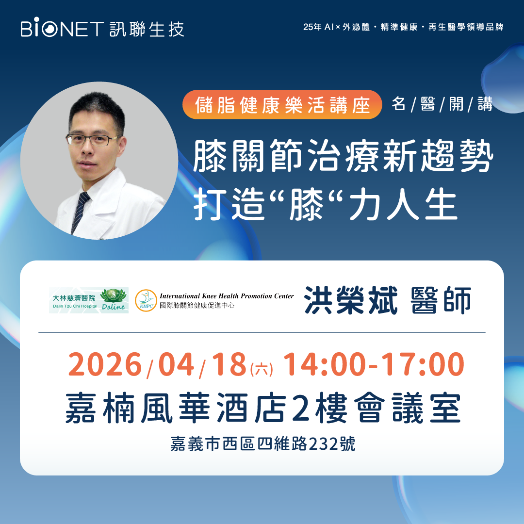 主題1:再生醫學新主張打造您的膝力人生 主題2:脂肪幹細胞與外泌體的神奇魔力 講師1:奇美醫學中心林敬為醫師 講師2:訊聯專業講師 |