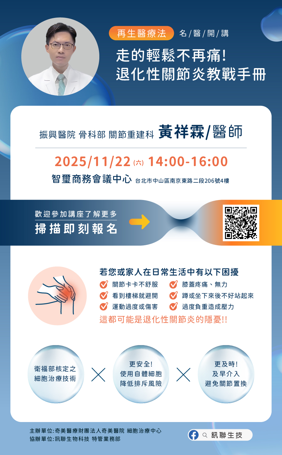 主題:走的輕鬆不再痛!退化性關節炎教戰手冊 講師1:振興醫院骨科部關節重建科-黃祥霖醫師 講師2:訊聯專業講師 |