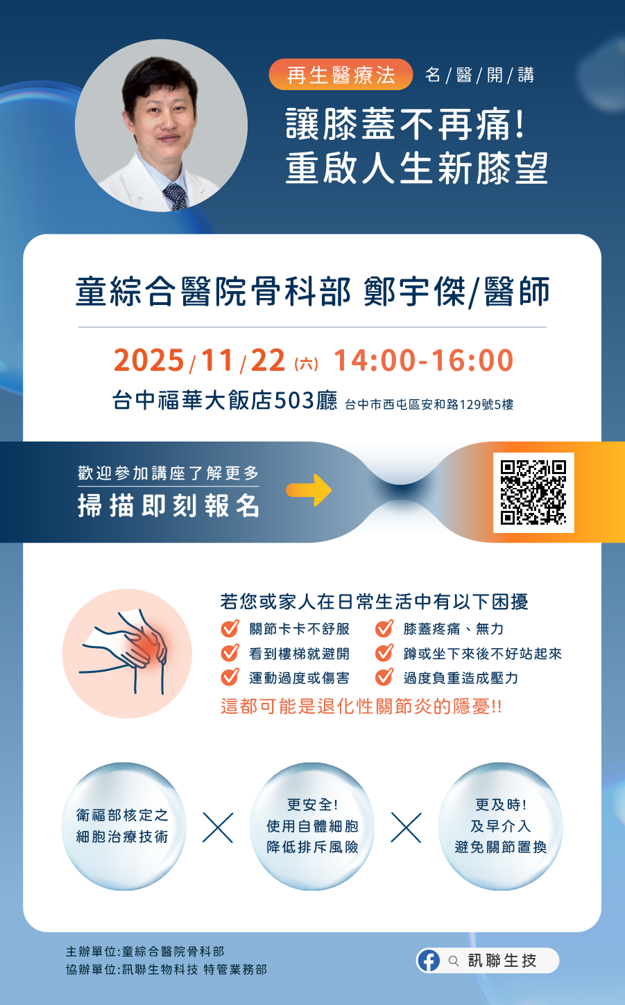 主題1:讓膝蓋不再痛!重啟人生新膝望 主題2:脂肪幹細胞&外泌體的再生潛力 講師1:童綜合醫院- 關節重建中心主任 鄭宇傑醫師 講師2:訊聯專業講師 |