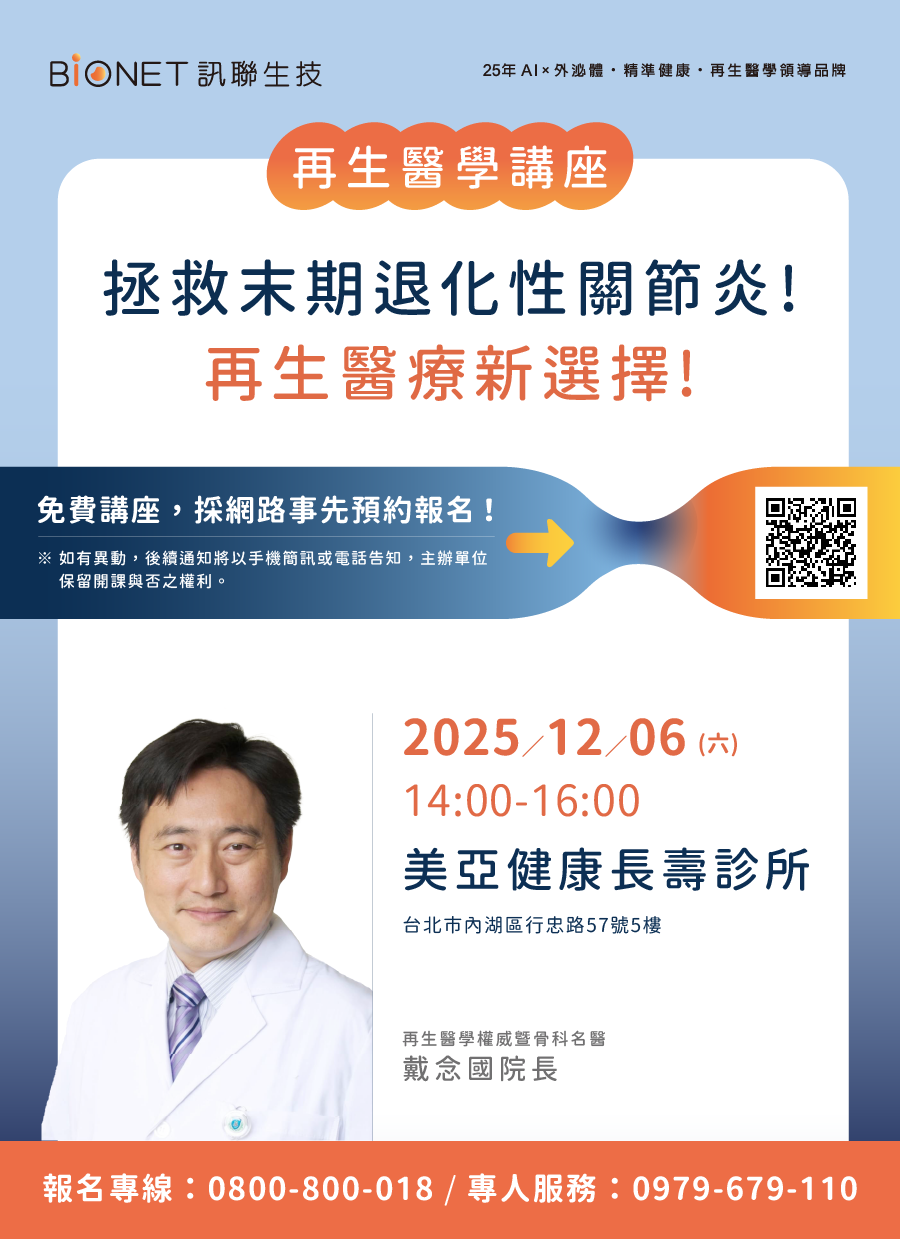 主題1:拯救末期退化性關節炎!再生醫療新選擇! 主題2:脂肪中的健康密碼 講師1:再生醫學權威暨骨科名醫|戴念國院長 講師2:訊聯專業講師 ✨ 與再生醫學權威暨骨科名醫 面對面詳談! ✨ 專屬邀請 需事前預約 ✨ 預約請洽 黃子倚 ☎ 0979-679-110 |