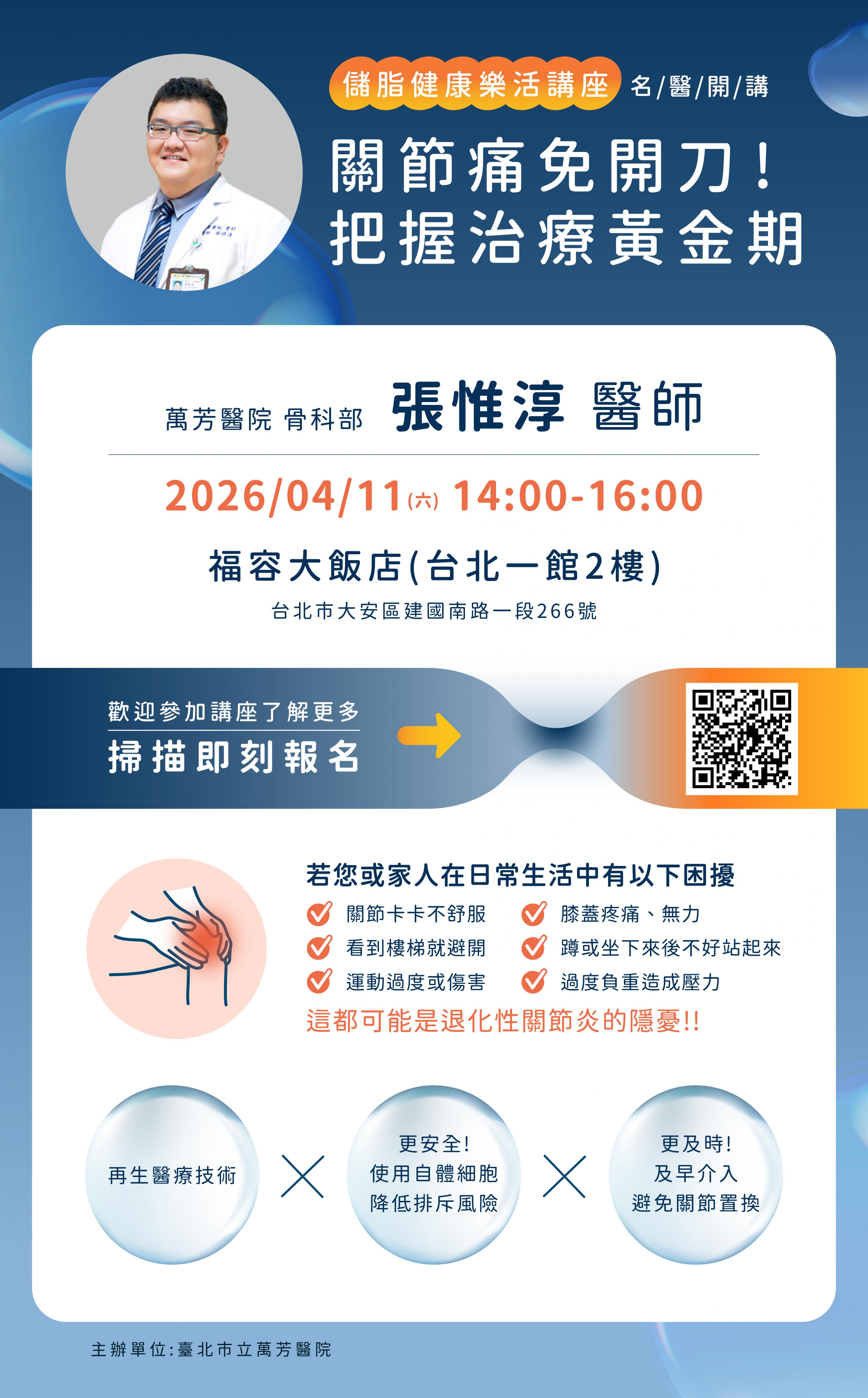 主題1:醫師見面會-關節痛免開刀!把握治療黃金期 主題2:脂肪中的健康密碼 講師1:萬芳醫院骨科-張惟淳醫師 講師2:訊聯專業講師 1.請憑手機簡訊『報到序號』報到入場 2.課程時間(14:00-16:00),課程開始將不開放進場, 請提早報到領取資料 3.飯店免費停車(車位有限.建議提早候位) 4.交通方式:(捷運)忠孝新生3號出口/大安站1號出口/大安森林公園站6號出口,再步行15分鐘 5.訊聯保留隨時修改、變更、暫停或終止本活動內容之權利 ![]() 活動洽詢專線:0958-009-602 服務專員-吳小姐 |